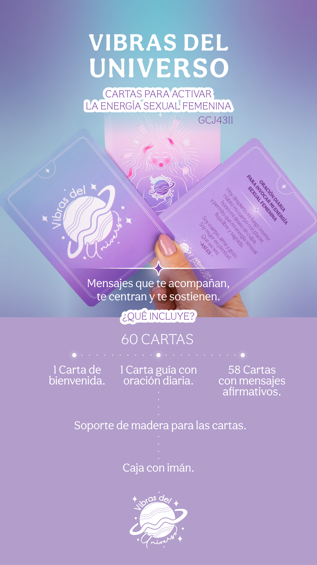 58 cartas con mensajes afirmativos, que refuerzan, despiertan y recuerdan el poder de la energía que ya habita en ti.