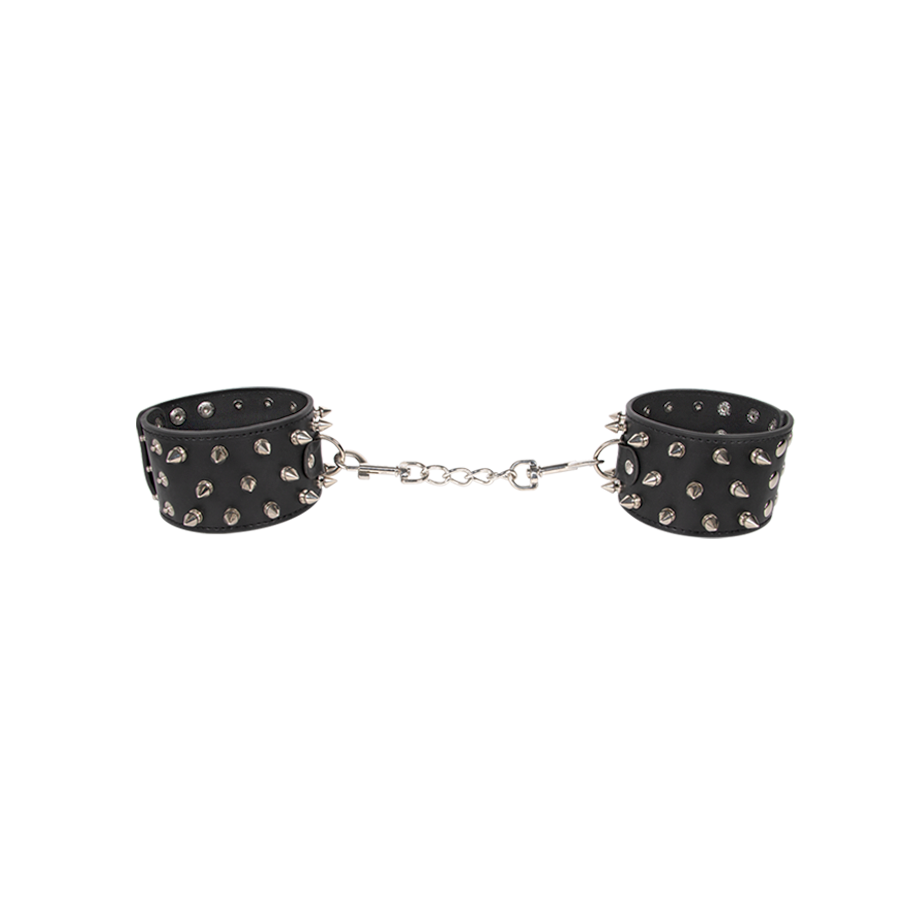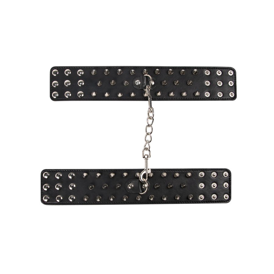 Accesorio para los pies que se convierten en esposas, con pequeños taches a su alrededor.