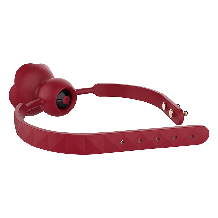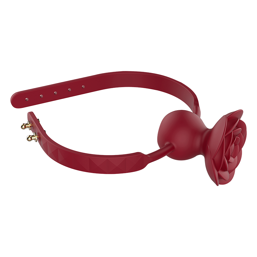 Hermosa Ball gag en forma de rosa y 9 ritmos de vibración que podrás manejar desde su control remoto.