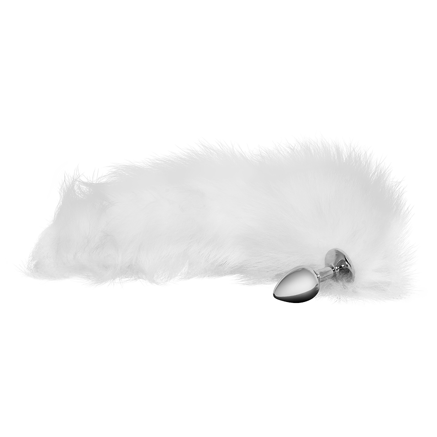 Cola de zorro sintética blanca con plug anal metálico incorporado para juegos de roles fetichistas y cosplay.